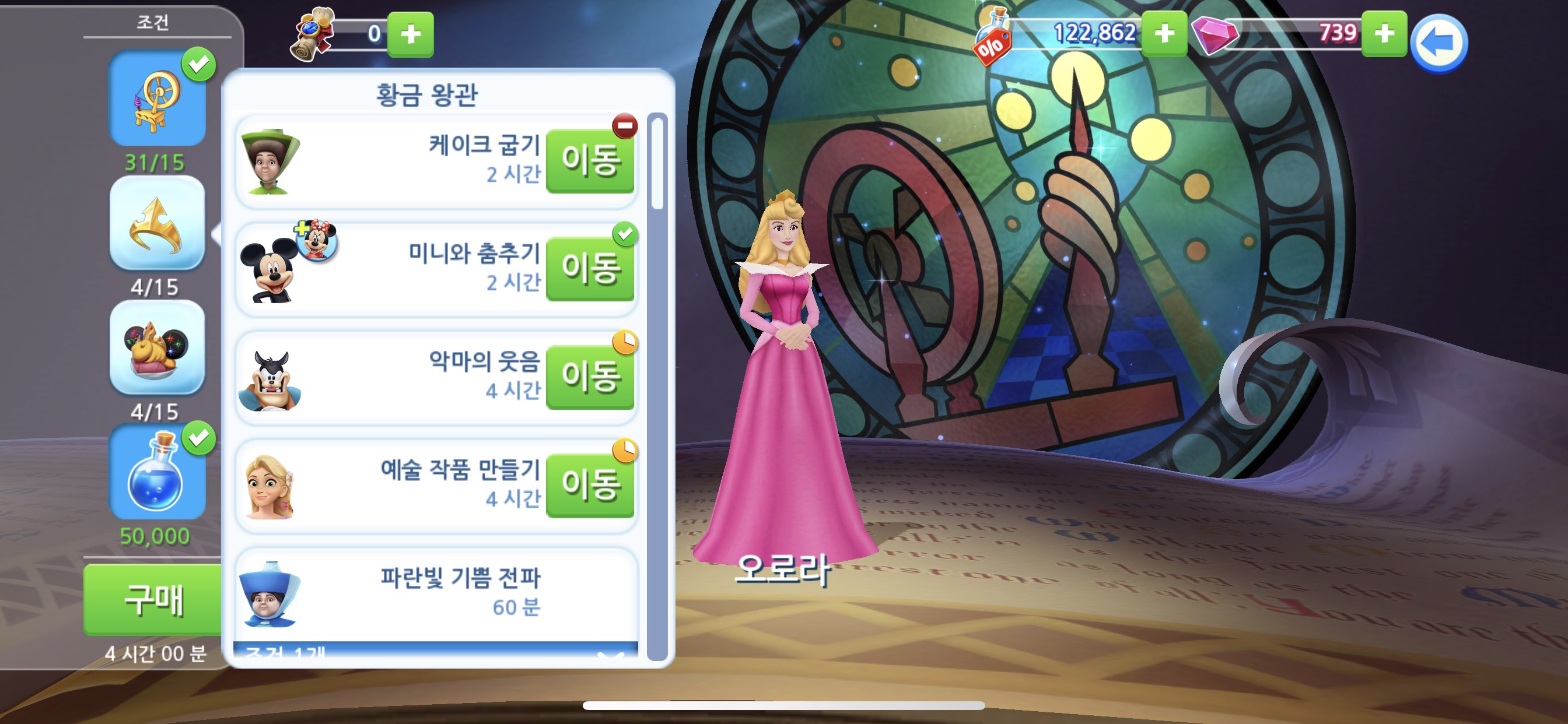 오로라 공주님을 맞이하기 위해서 필요한 토큰들이 왼쪽에 보이네요.