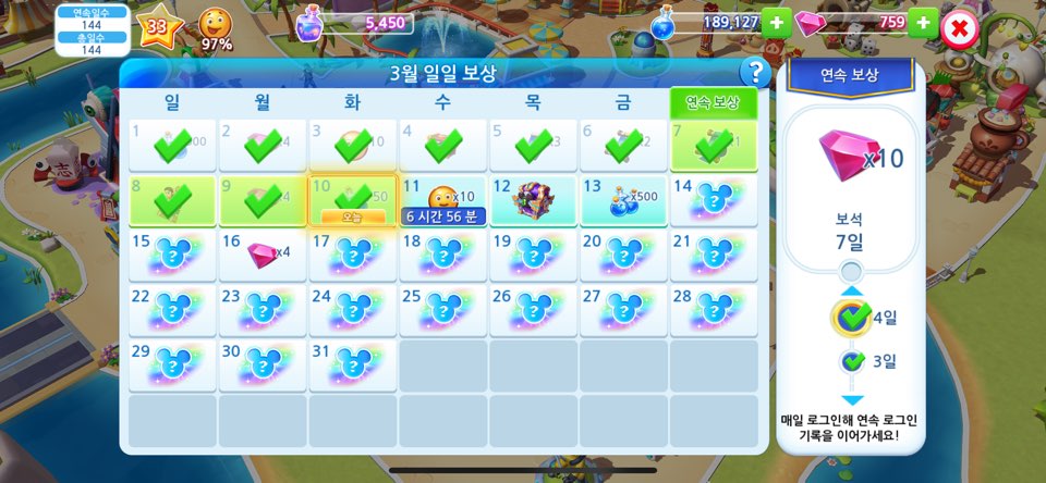 오른쪽 연속 보상은 매번 바뀌고 꽤 좋은 보상이 많이 등장하니, 우리는 모두 하루도 빠짐없이 출석체크를 하도록 합시다!