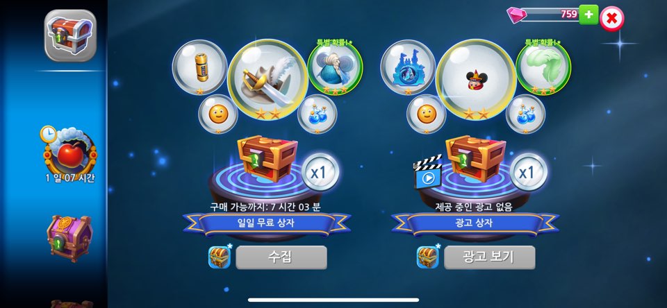 그리고 오른쪽에 '광고 상자'라고 되어있는 것은 약 30초 정도의 광고를 보면 받을 수 있는 상자입니다!