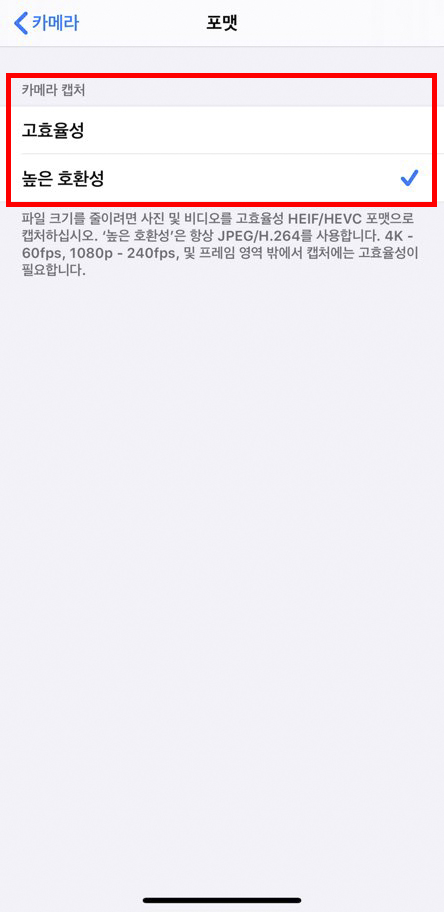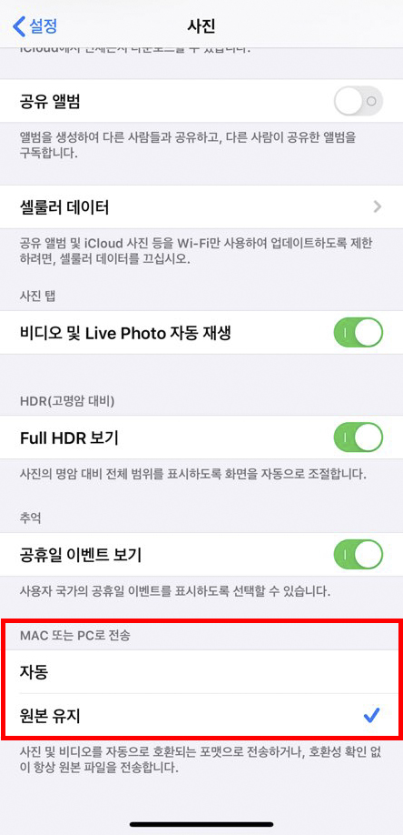 아마 이 설정을 아무것도 손 대지 않으신 분들은 자동에 체크가 되어있을 거예요! 이 부분을 [원본 유지]로 바꾸어주면 피씨로 영상을 옮기실 때 오류 발생이 더이상 생기지 않을 것입니다.