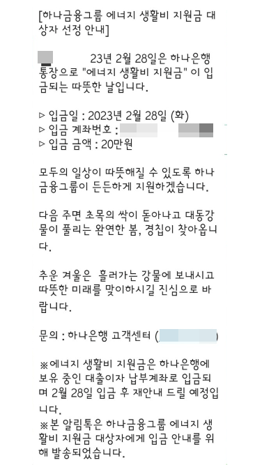 지난 2월 28일 일부 하나은행 고객들은 하나금융그룹 에너지 생활비 지원금 대상자 선정 안내문을 문자로 전달받았습니다. 내용인즉, "2023년 2월 28일은 하나은행 통장으로 "에너지 생활비 지원금" 이 입금되는 따뜻한 날입니다."라고 적혀있습니다. ▷ 입금일 : 2023년 2월 28일 (화) ▷ 입금 금액 : 20만 원 이라고 적혀있습니다.