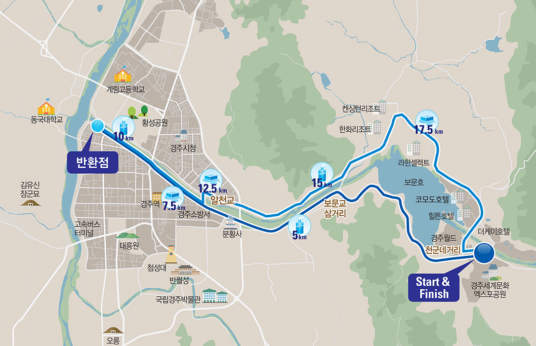- 단축코스 10km : 보덕동행정복지센터 앞(출발)→ 경주월드방향 우회전 후(반환) → 천군네거리 → 커피명가 앞 → 보문삼거리 → 한화리조트 앞 → 현대호텔 → 코모도호텔 → 힐튼호텔사거리 → 천군네거리 → 보덕동행정복지센터 (골인)